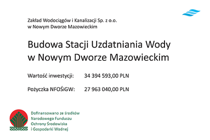 W dniu 13 lipca 2023 r. Zarząd Zakładu Wodociągów i Kanalizacji Sp. z o.o. w Nowym Dworze Mazowieckim podpisał Umowę nr 1337/2023/Wn07/NZ-ur-lz/P o dofinansowanie, w formie pożyczki, realizacji przedsięwzięcia “Budowa Stacji Uzdatniania Wody w Nowym Dworze Mazowieckim”. Dofinansowanie w wysokości 27 963 040,00 zł przyznanł Spółce Narodowy Fundusz Ochrony Środowiska i Gospodarki Wodnej.